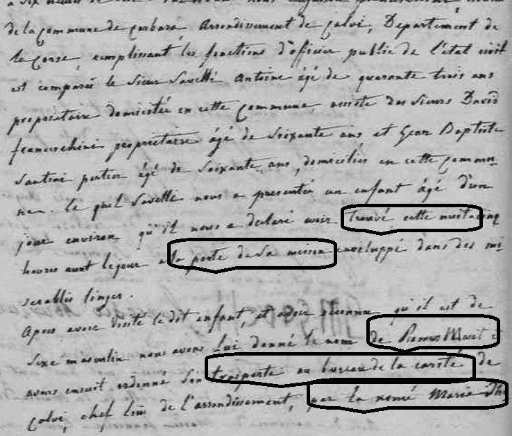 En regardant les naissances de 1845, nous avons trouvé son acte de naissance en date du premier juin 1845 page 170 du registre de l'état civil de Corbara (1840-1845). Nous apprenons que l'enfant a été déposé devant la porte de la mairie.