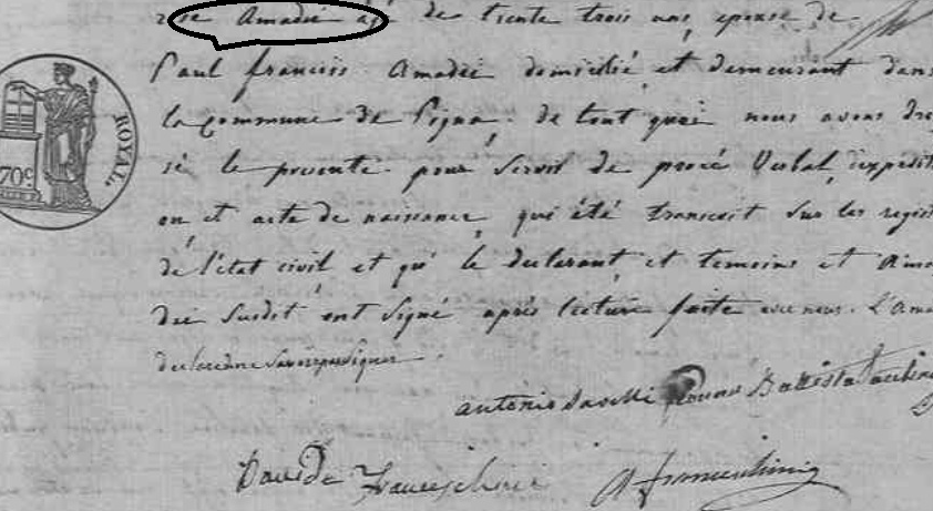 Son nom Amadei vient surement du fait que l'enfant a été transporté au couvent de la charité de Calvi par Maria Teresa Amadei de Pigna, tel que stipulé dans l'acte de naissance.